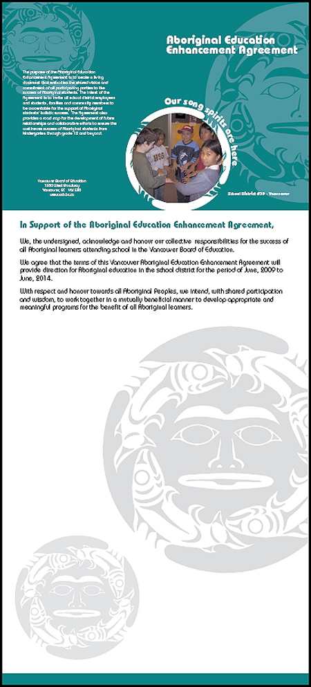 The Vancouver School Board headed this initiative to provide an agreement for communities, educators and students to enhance the educational culture for aboriginal students. The agreement design uses the aboriginal logo as the main design element, as well as the specific band colour of the logo.